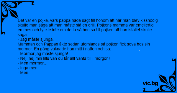 Det var en pojke, vars pappa hade sagt till honom att när man blev kissnödig skulle man säga att man måste slå en drill. Pojkens mamma var emellertid en mes och tyckte inte om detta så hon sa till pojken att han istället skulle säga: