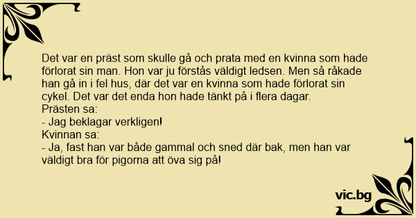 Det var en präst som skulle gå och prata med en kvinna som hade förlorat sin man. Hon var ju förstås väldigt ledsen. Men så råkade han gå in i fel hus, där det var en kvinna som hade förlorat sin cykel. Det var det enda hon hade tänkt på i flera dagar.