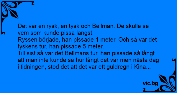 Till sist så var det Bellmans tur, han pissade så långt att man inte kunde se hur långt det var men nästa dag i tidningen, stod det att det var ett guldregn i Kina...
