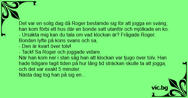 Det var en solig dag då Roger bestämde sig för att jogga en sväng, han kom förbi ett hus där en bonde satt utanför och mjölkade en ko.