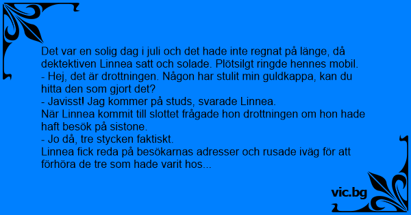 Det var en solig dag i juli och det hade inte regnat på länge, då dektektiven Linnea satt och solade. Plötsilgt ringde hennes mobil.