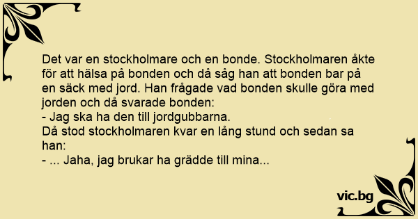 Det var en stockholmare och en bonde. Stockholmaren åkte för att hälsa på bonden och då såg han att bonden bar på en säck med jord. Han frågade vad bonden skulle göra med jorden och då svarade bonden: