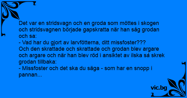 Det var en stridsvagn och en groda som möttes i skogen och stridsvagnen började gapskratta när han såg grodan och sa: