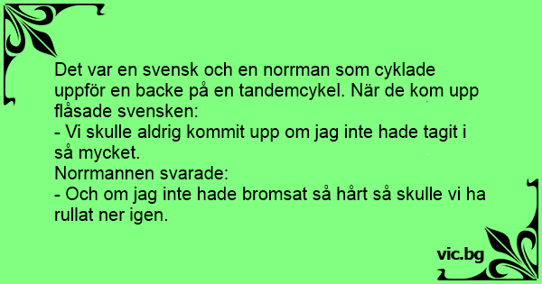 Det var en svensk och en norrman som cyklade uppför en backe på en tandemcykel. När de kom upp flåsade svensken: