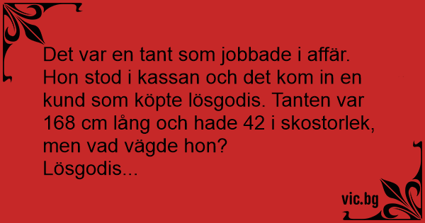 Det var en tant som jobbade i affär. Hon stod i kassan och det kom in en kund som köpte lösgodis. Tanten var 168 cm lång och hade 42 i skostorlek, men vad vägde hon?