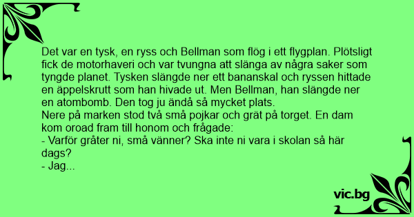Det var en tysk, en ryss och Bellman som flög i ett flygplan. Plötsligt fiск de motorhaveri och var tvungna att slänga av några saker som tyngde planet. Tysken slängde ner ett bananskal och ryssen hittade en äppelskrutt som han hivade ut. Men Bellman, han slängde ner en atombomb. Den tog ju ändå så mycket plats.