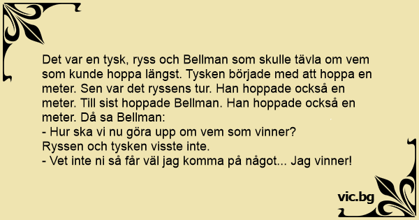 Det var en tysk, ryss och Bellman som skulle tävla om vem som kunde hoppa längst. Tysken började med att hoppa en meter. Sen var det ryssens tur. Han hoppade också en meter. Till sist hoppade Bellman. Han hoppade också en meter. Då sa Bellman: