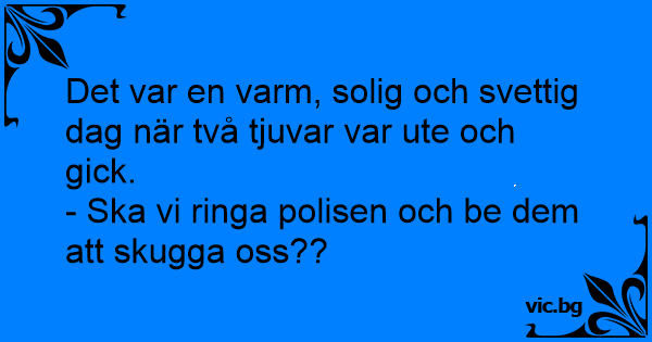 Български English Deutsch Español Русский Français Italiano Ελληνικά Македонски Türkçe Українська Português Polski Det var en varm, solig och svettig dag när två tjuvar var ute och gick. – Ska vi ringa polisen och be dem att skugga oss?? Nederlands Dansk Norsk Suomi Magyar Româna Čeština Lietuvių Latviešu Hrvatski