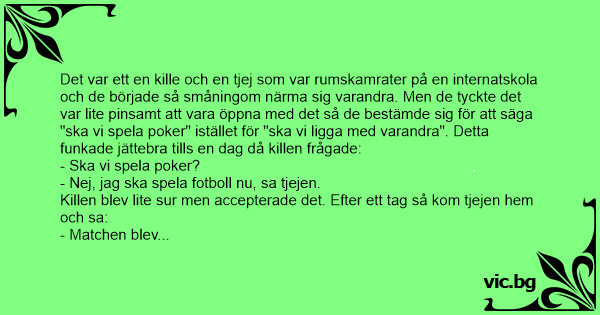 Det var ett en kille och en tjej som var rumskamrater på en internatskola och de började så småningom närma sig varandra. Men de tyckte det var lite pinsamt att vara öppna med det så de bestämde sig för att säga "ska vi spela poker" istället för "ska vi ligga med varandra". Detta funkade jättebra tills en dag då killen frågade: