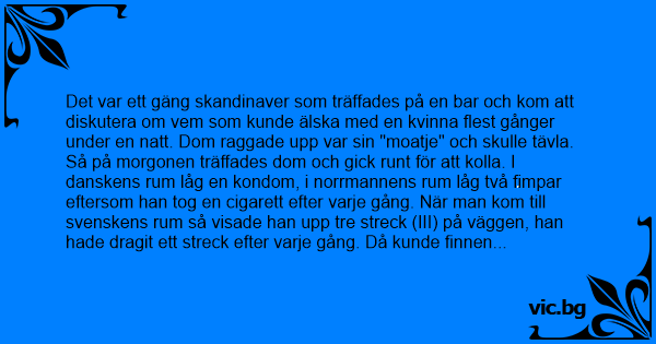 Så på morgonen träffades dom och gick runt för att kolla. I danskens ruм låg en kondom, i norrmannens ruм låg två fimpar eftersom han tog en cigarett efter varje gång. När man kom till svenskens ruм så visade han upp tre streck (III) på väggen, han hade dragit ett streck efter varje gång. Då kunde finnen inte hålla tyst utan utbrast: