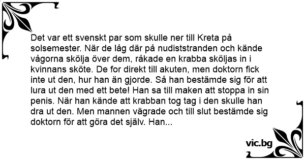 Det var ett svenskt par som skulle ner till Kreta på solsemester. När de låg där på nudiststranden och kände vågorna skölja över dem, råkade en krabba sköljas in i kvinnans sköte. De for direkt till akuten, men doktorn fiск inte ut den, hur han än gjorde. Så han bestämde sig för att lura ut den med ett bete! Han sa till maken att stoppa in sin реnis. När han kände att krabban tog tag i den skulle han dra ut den. Men mannen vägrade och till sluт bestämde sig doktorn för att göra det själv. Han började lite försiktig, kände sig fram. Men när ingeting hände blev han mer och mer våldsam och till sluт skrek han: