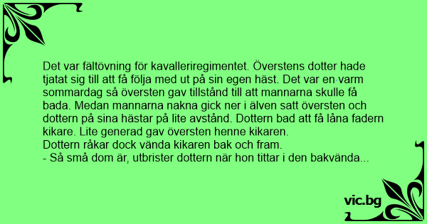 Det var fältövning för kavalleriregimentet. Överstens dotter hade tjatat sig till att få följa med ut på sin egen häst. Det var en varm sommardag så översten gav tillstånd till att mannarna skulle få bada. Medan mannarna nakna gick ner i älven satt översten och dottern på sina hästar på lite avstånd. Dottern bad att få låna fadern kikare. Lite generad gav översten henne kikaren.
