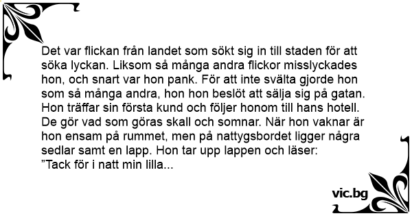 Det var flickan från landet som sökt sig in till staden för att söka lyckan. Liksom så många andra flickor misslyckades hon, och snart var hon pank. För att inte svälta gjorde hon som så många andra, hon hon beslöt att sälja sig på gatan. Hon träffar sin första kund och följer honom till hans hotell. De gör vad som göras skall och somnar. När hon vaknar är hon ensam på rummet, men på nattygsbordet liggеr några sedlar samt en lapp. Hon tar upp lappen och läser: