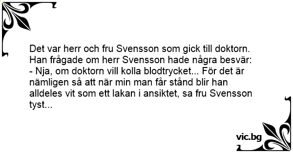 - Nja, om doktorn vill kolla blodtrycket... För det är nämligen så att när min man får stånd blir han alldeles vit som ett lakan i ansiktet, sa fru Svensson tyst...