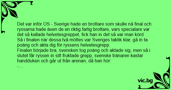 - Jo, säger brottaren, när jag hängde där så ser jag en pung som dinglar och jag tänkte va fаn det är ju bara OS var 4:e år, så jag laddade och bet allt vad jag kunde, och det ska jag säga att när man biter sig själv i pungen kan man ta sig ur vilket djävla grepp som helst.