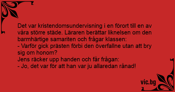Det var kristendomsundervisning i en förort till en av våra större städe. Läraren berättar liknelsen om den barmhärtige samariten och frågar klassen: