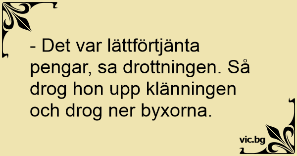 - Det var lättförtjänta pengar, sa drottningen. Så drog hon upp klänningen och drog ner byxorna.