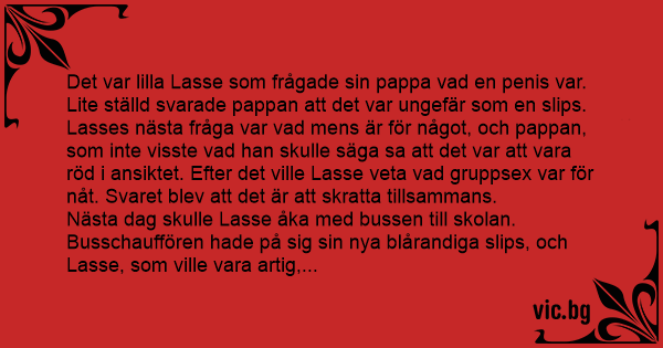 Det var lilla Lasse som frågade sin pappa vad en реnis var. Lite ställd svarade pappan att det var ungefär som en slips. Lasses nästa fråga var vad mens är för något, och pappan, som inte visste vad han skulle säga sa att det var att vara röd i ansiktet. Efter det ville Lasse veta vad gruppsex var för nåt. Svaret blev att det är att skratta tillsammans.