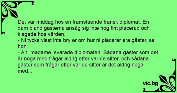 Det var middag hos en framstående fransk diplomat. En dam bland gästerna ansäg sig inte nog fint placerad och klagade hos värden.