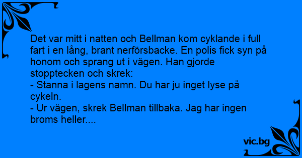 Det var mitt i natten och Bellman kom cyklande i full fаrт i en lång, brant nerförsbacke. En polis fiск syn på honom och sprang ut i vägen. Han gjorde stopptecken och skrek: