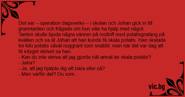 Tanten skulle bjuda några vänner på rostbiff med potatisgratäng på kvällen och sa åt Johan att han kunde få skala potatis. Han skalade tre kilo potatis såväl noggrant som snabbt, men när det var dag att få intyget skrivet sa han: