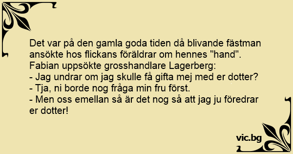 Det var på den gamla goda tiden då blivande fästman ansökte hos flickans föräldrar om hennes "hand". Fabian uppsökte grosshandlare Lagerberg: