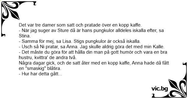 Kalte Eier Trois copines discutent, l’une dit : Разговаривают три женщины на работе: Седят три девойки на кафе и си лафят. Първата казва: Розмовляють три жінки на роботі: Drie vriendinnen zitten te kletsen. "Zeg, weet je, als ik mijn Peter pijp, heeft hij altijd koude ballen." "Dat is grappig", zegt de tweede, "als ik dat bij mijn Dirk doe, is dat ook zo." "En jij",... Três mulheres conversavam.Disse a primeira: — Sabem, o saco do José, meu marido, é frio... Disse a segunda: — Hoje, verei como é o saco do Manuel... No dia seguinte, falou a segunda mulher: — É,... Maria, Fátima e Conceição, três amigas portuguesas, estavam tomando um chazinho juntas e botando a conversa em dia. Maria pergunta para Fátima: — Quando estás a fazer amor com teu marido, o... TRES amigas se encuentran conversando: 'A Roberto, cuando hacemos el amor, se le calientan los testículos' dice una de ellas. 'Parece que eso le pasa a todos los hombres, porque a Arturo también le... Tre piger diskuterer Tre piger diskuterer blowjob. Den første siger; Ib har altid kolde nosser når jeg sutter ham, det har Jan også, siger den anden. Hvad med din kæreste, har han også kolde løg?... Egy szőke, egy barna és egy vörös elmegy kávézni. Így szól a barna: - Tegnap este dugtam a Bélával, megfogtam a golyóit, és hidegek voltak. Másnap a vörös: - Tegnap dugtam a Lacival, megfogtam a... Three girlfriends are talking about their partners. “Every time I stroke Frank’s balls they’re freezing cold,” says Sandra. “Wow, same for me,” says Angie. “Every time I stroke Dave’s balls they’re... "Det er sjovt", siger den første. "Men Peters testikler er altid helt iskolde, når jeg giver ham et blowjob." "Det var da mærkeligt, Sådan er det også med min Søren" siger den anden pige. De vender... Bir gün üg evli kadin toplanir - "Dün gece biraz kasindim, Yatakta Muhittin e yaklastim... Isteksizdi... Tasaklarini tuttum.. baktim sojuk. Buz gibi.. Sordum .. "Niye tasaklarn soguk.?" Homurdanip...