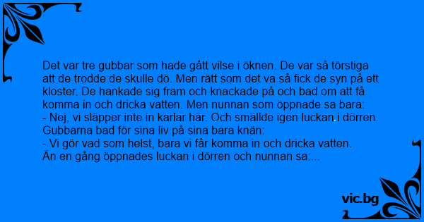 Det var tre gubbar som hade gått vilse i öknen. De var så törstiga att de trodde de skulle dö. Men rätt som det va så fiск de syn på ett kloster. De hankade sig fram och knackade på och bad om att få komma in och dricka vatten. Men nunnan som öppnade sa bara:
