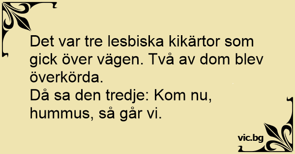 Det var tre lesbiska kikärtor som gick över vägen. Två av dom blev överkörda.