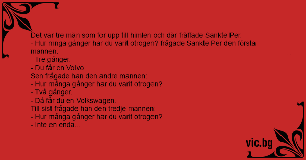 - Hur mnga gånger har du varit otrogen? frågade Sankte Per den första mannen.