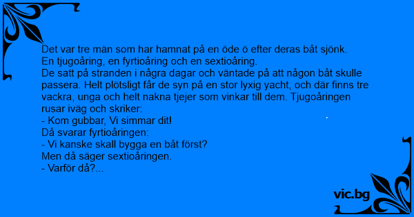 De satt på stranden i några dagar och väntade på att någon båt skulle passera. Helt plötsligt får de syn på en stor lyxig yacht, och där finns tre vackra, unga och helt nakna tjejer som vinkar till dem. Tjugoåringen rusar iväg och skriker: