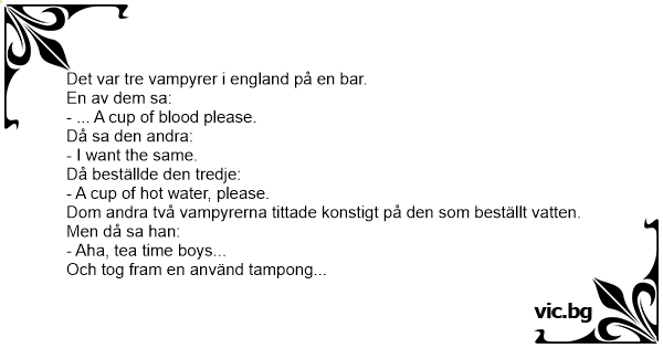 Det var tre vampyrer i england på en bar. En av dem sa: - ... A cup of blood please. Då sa den andra: - I want the same. Då beställde den tredje: - A cup of hot water, please. Dom andra två vampyrerna tittade konstigt på den som beställt vatten. Men då sa han: - Aha, tea time boys... Och tog fram en använd tampong...