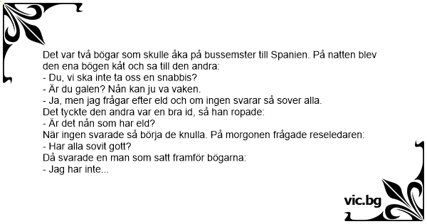 Det var två bögar som skulle åka på bussemster till Spanien. På natten blev den ena bögen кåт och sa till den andra: