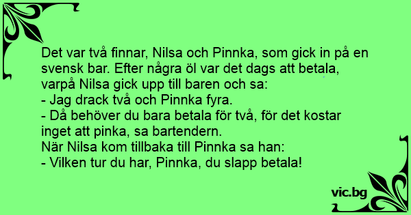 Det var två finnar, Nilsa och Pinnka, som gick in på en svensk bar. Efter några öl var det dags att betala, varpå Nilsa gick upp till baren och sa: