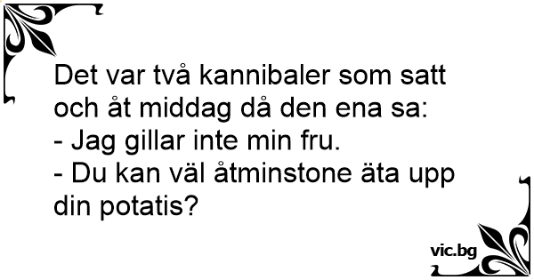 Kannibalerna äter lunch. Den ena säger plötsligt: – Jag tycker inte om din fru. – Du kan väl äta upp potatisen åtminstone.