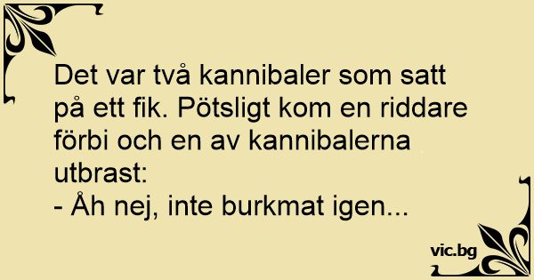 Det var två kannibaler som väntade på mat då en riddare kom förbi. Den ena sa: - Åååå nej, inte burk mat nu igen!