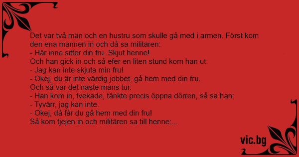 Det var två män och en hustru som skulle gå med i armen. Först kom den ena mannen in och då sa militären:
