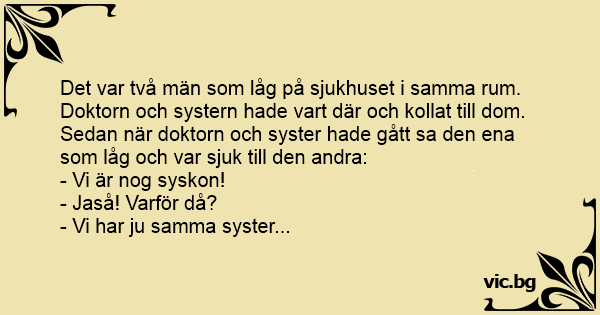 Det var två män som låg på sjukhuset i samma ruм. Doktorn och systern hade vart där och kollat till dom. Sedan när doktorn och syster hade gått sa den ena som låg och var sjuk till den andra: