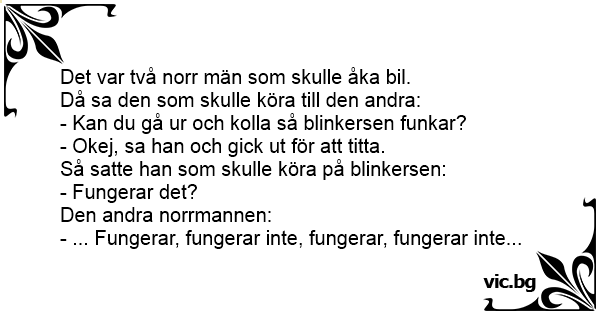 Det var en Svensk turist som var ute och åkte bil i Norge. Han svängde in på en verkstad för att kolla så att alla lampor på bilen fungerade. - Kan jag få hjälp med en sak? Frågade svensken. -...