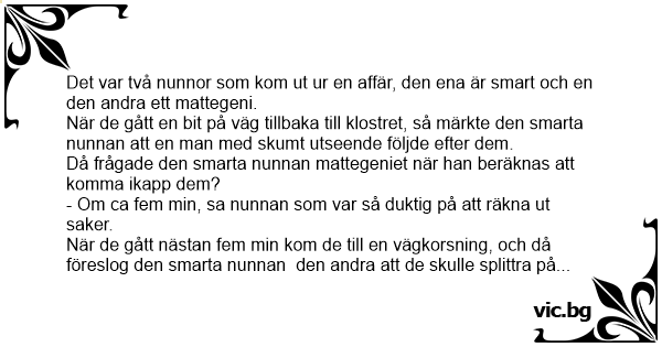 Två nunnor är ute och går. Den ena kallas Syster Matematik - SM på grund av hennes skarpa matematiska sinne. Den andra kallas Syster Logik - SL, eftersom hon är så logisk. Det blir mörkt och nunnorna är fortfarande långt ifrån klostret. SM: - Har du...