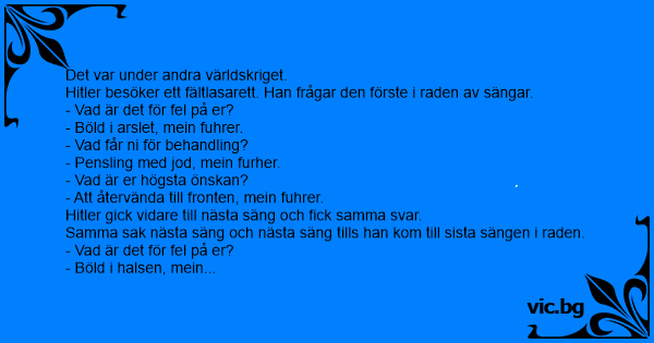 Hitler besöker ett fältlasarett. Han frågar den förste i raden av sängar.