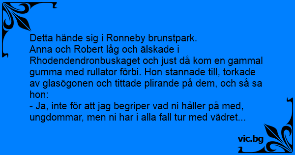 Anna och Robert låg och älskade i Rhodendendronbuskaget och just då kom en gammal gumma med rullator förbi. Hon stannade till, torkade av glasögonen och tittade plirande på dem, och så sa hon: