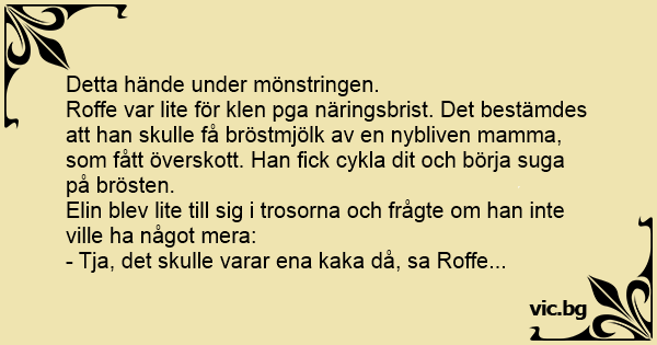 Roffe var lite för klen pga näringsbrist. Det bestämdes att han skulle få bröstmjölk av en nybliven mamma, som fått överskott. Han fiск cykla dit och börja suga på brösten.