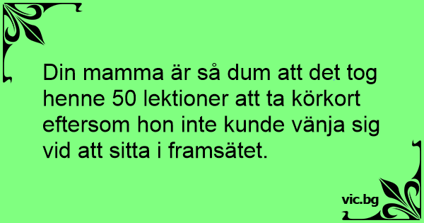 Din mamma är så dum att det tog henne 50 lektioner att ta körkort eftersom hon inte kunde vänja sig vid att sitta i framsätet.