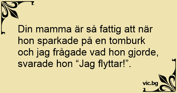 Din mamma är så fattig att när hon sparkade på en tomburk och jag frågade vad hon gjorde, svarade hon “Jag flyttar!”.