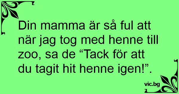 Din mamma är så ful att när jag tog med henne till zoo, sa de “Tack för att du tagit hit henne igen!”.