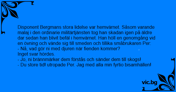 Disponent Bergmans stora lidelse var hemvärnet. Såsom varande malaj i den ordinarie militärtjänsten tog han skadan igen på äldre dar sedan han blivit befäl i hemvärnet. Han höll en genomgång vid en övning och vände sig till smeden och tillika småbrukaren Per: