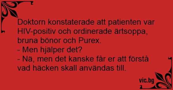 Doktorn konstaterade att patienten var НIV-positiv och ordinerade ärtsoppa, bruna bönor och Purex.