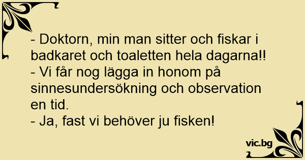 - Doktorn, min man sitter och fiskar i badkaret och toaletten hela dagarna!!