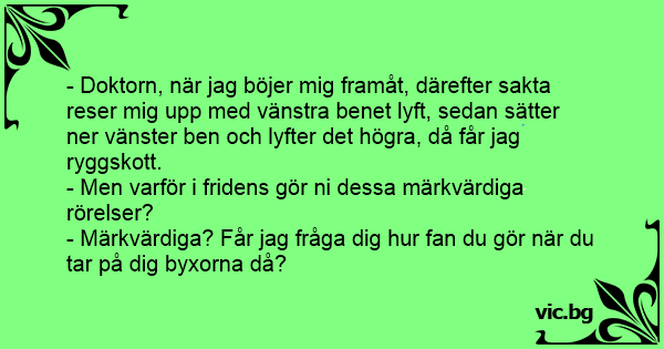 - Doktorn, när jag böjer mig framåt, därefter sakta reser mig upp med vänstra benet lyft, sedan sätter ner vänster ben och lyfter det högra, då får jag ryggskott.